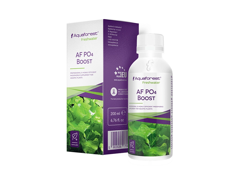 O uso regular de Aquaforest AF Fosfatos (PO4) Boost evita deficiências que podem retardar o crescimento, causar escurecimento e deterioração das pontas das folhas. O uso regular de Aquaforest AF Fosfatos (PO4) Boost permite complementar a deficiência deste valioso macroelemento na água e compensa na forma de desenvolvimento foliar saudável e exuberante numa fase posterior de crescimento. O nível recomendado de fosfatos no aquário é de 0,5-1,5 mg/l.